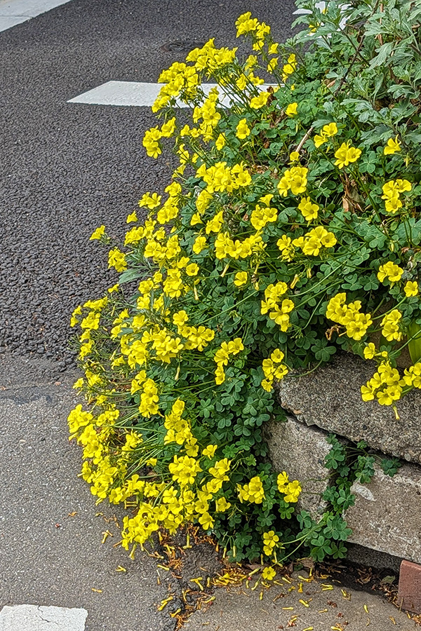 道路際に、一般的には雑草扱いの片喰(カタバミ)を密植されていて