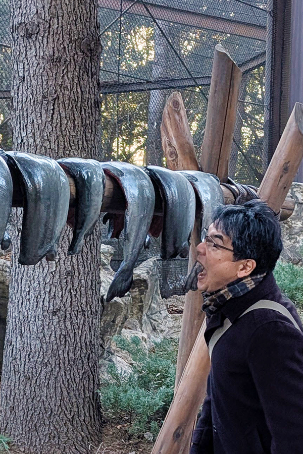 園内に干されていた鮭を密かにつまみ食いする人間。