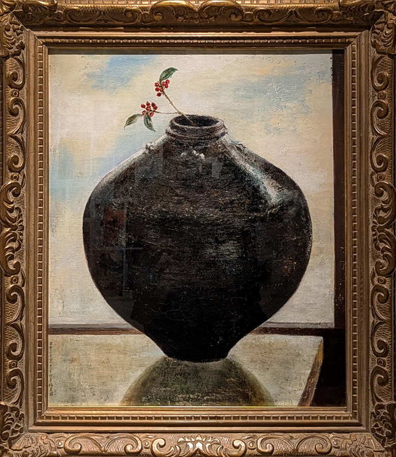 椿貞雄「黒い壺に南天」油彩・カンヴァス