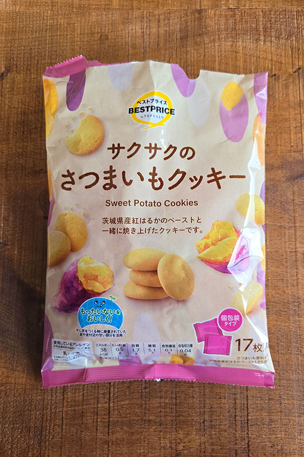 トップバリュー サクサクのさつまいもクッキー 食欲の秋、薩摩芋の季節でございますね。 と言う訳で、初めて購入したのがコチラ。 開けてみるとこんな感じ。 我が人生において、おさつスナックと双璧の美味しさでございました。
