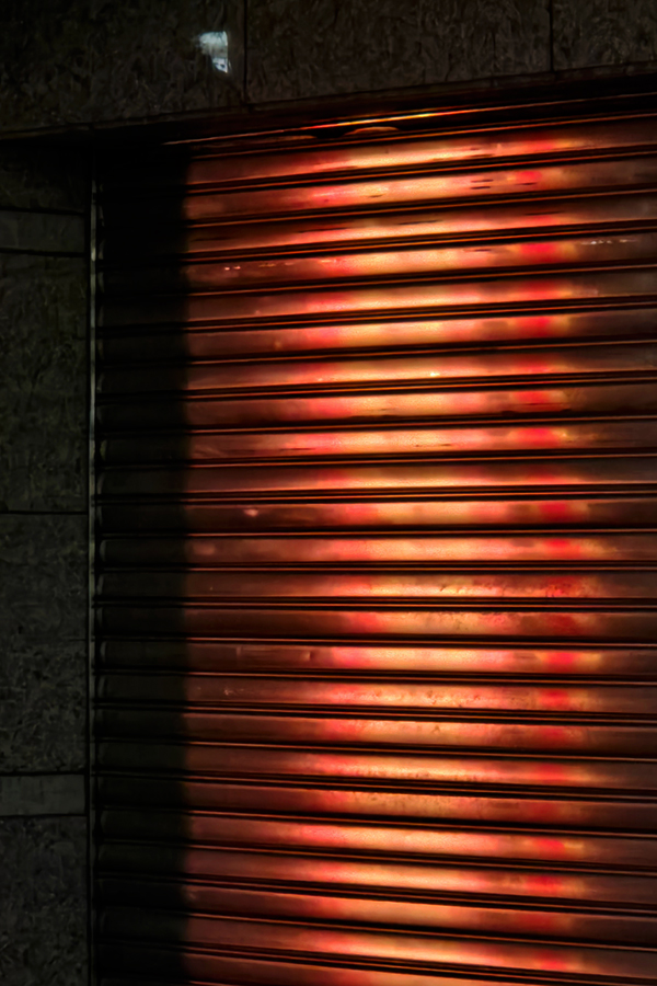 ステンレスシャッターに映った灯りが綺麗だったのでパシャリ。