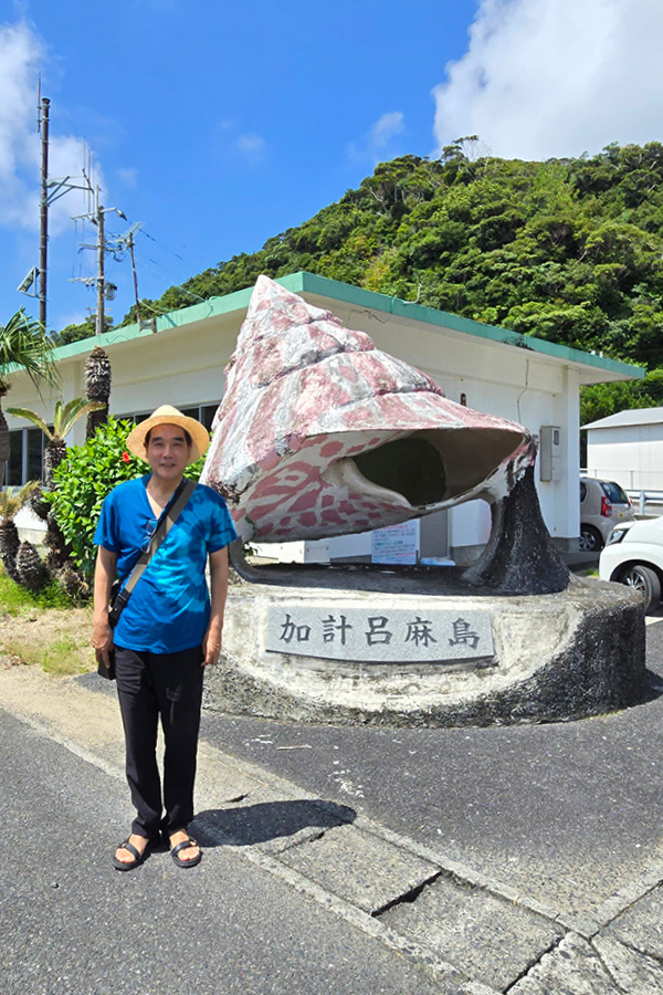 港にあった大きな高瀬貝のオブジェ前で記念撮影。