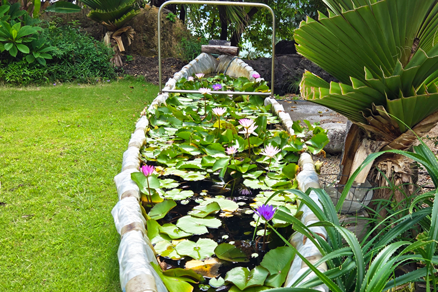 工場の向かいで、廃船を睡蓮鉢にしておられました。