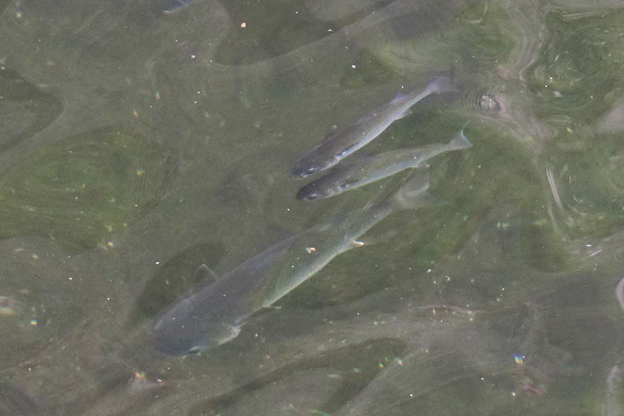 川を覗き込むと鰡(ボラ)らしき魚の群れ。