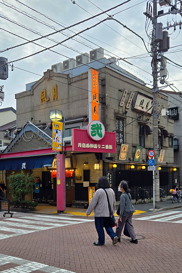 角に建つ「もんじゃ風月 月島店」も見事な看板建築です。
