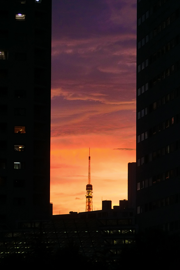 高層ビルの間に東京タワーのシルエットが💛