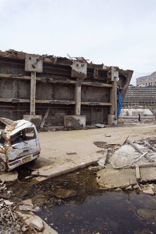 (写真は2011年8月末に撮影したもの、基礎ごと倒れてしまった3階建ての建物です)