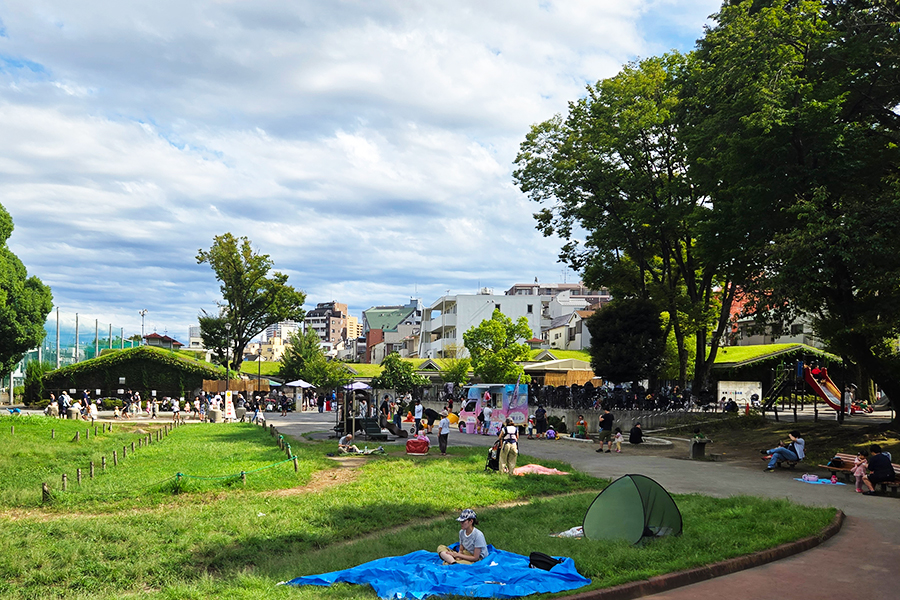 草屋根の園舎が並び、隣の公園と良く馴染んでいます。