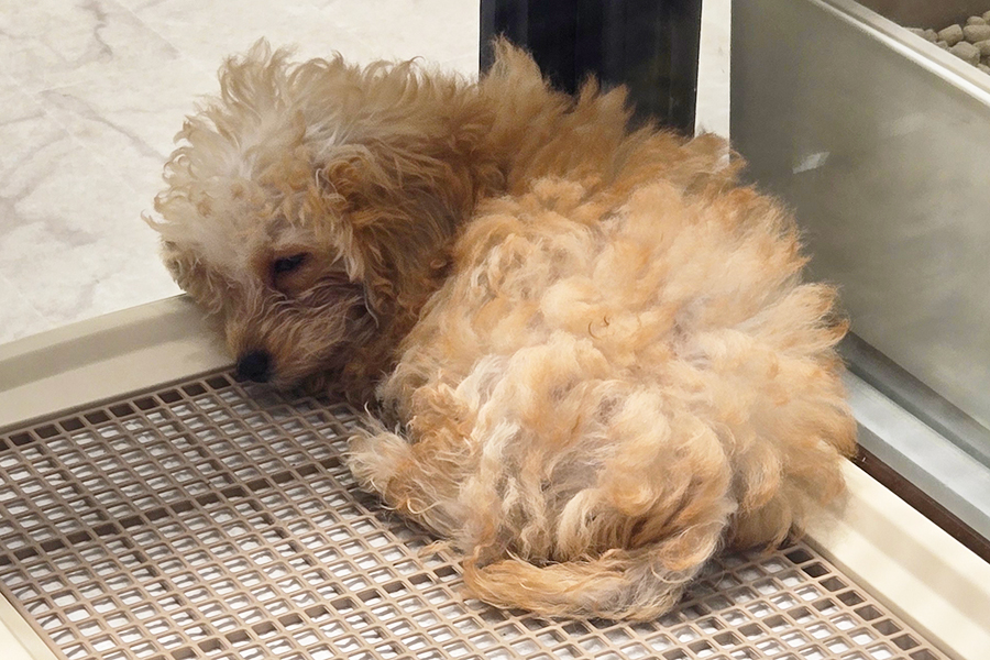 ペットショップ店頭でスヤスヤ眠るワンちゃん。未だ子供ですよね、可愛い💛