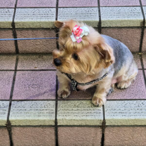 スーパーの入口にて、飼い主を大人しく待つお利口なワンちゃん。リボンがかわゆす💛