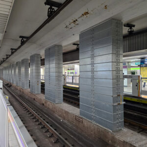 今まで気付きませんでしたが、半蔵門線ホームの柱に耐震補強が!