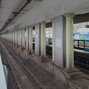 この形式は、以前御覧に入れた池尻大橋駅と同じくコンクリート柱を鋼板で巻く方式と思われます。