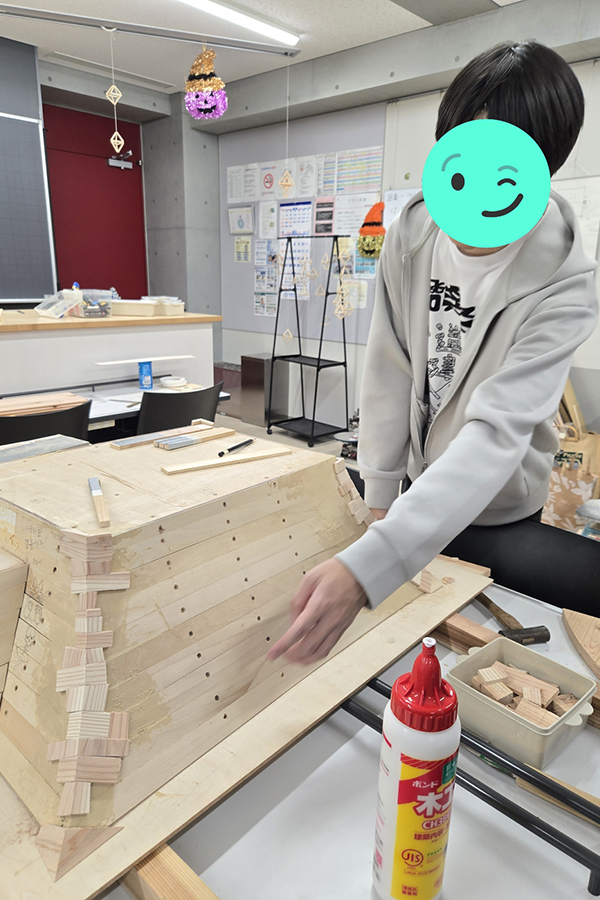 木造建築科の1年生M君が石垣の作り方について説明してくれました。