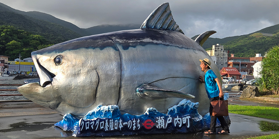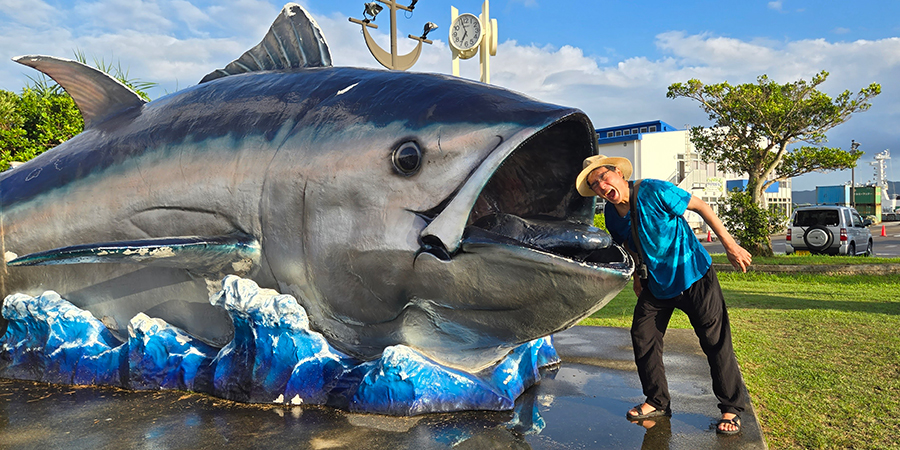 港で一旦お別れしてそれぞれ夕食をとる事に。その前に巨大マグロと記念撮影。