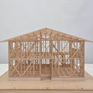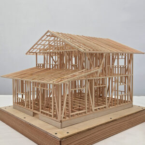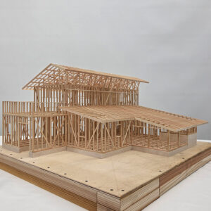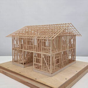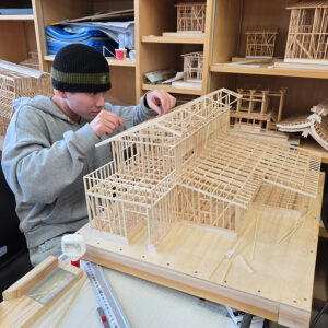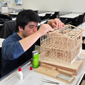 2階建て住宅の小屋組を製作中のE君。もうすぐ完成しそうです。