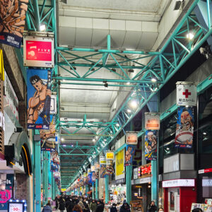 アーケードの入口に漫画「魁!!男塾」の巨大な看板が!