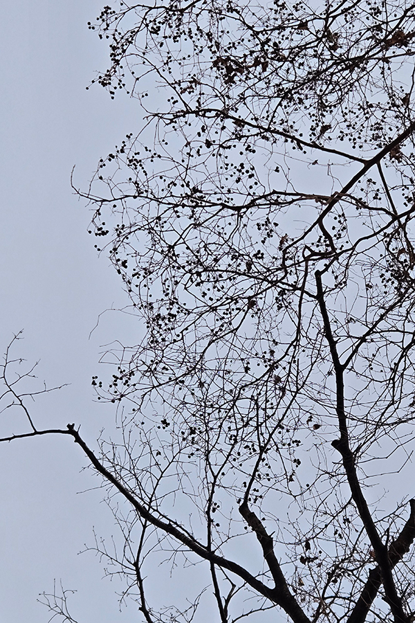 葉の落ちた百日紅(サルスベリ)の大木を見上げるの図。