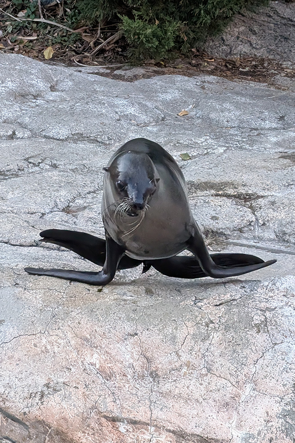 園路に置かれたベンチの脚にはオカピが!